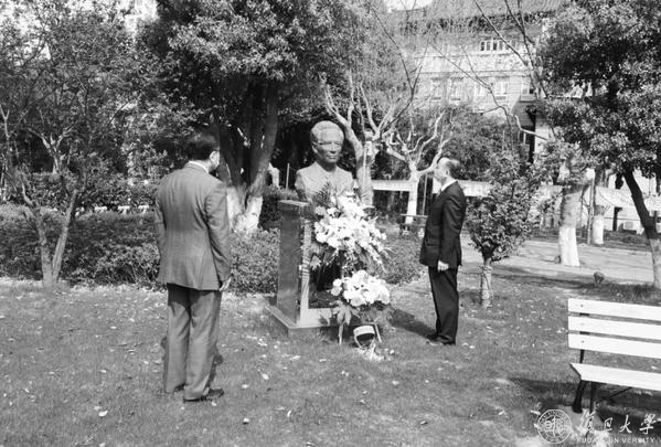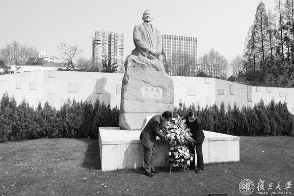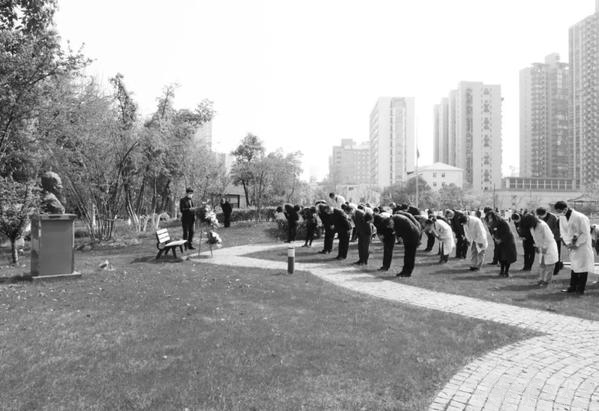 在集体哀悼活动之前,一场特别的追思缅怀活动在东苑宣誓广场举行。葱郁的广场上,16位一级教授塑像前,来自复旦大学附属中山医院、华山医院、儿科医院、公共卫生临床中心的8名抗疫一线“白衣战士”,向上医先贤敬献鲜花,30名医学生身着白袍,高举右拳,重温“医学生誓言”。抗疫英雄和青年医学生用这样的方式向先贤表达最崇高的敬意和最深切的缅怀。追思活动由桂永浩主持。