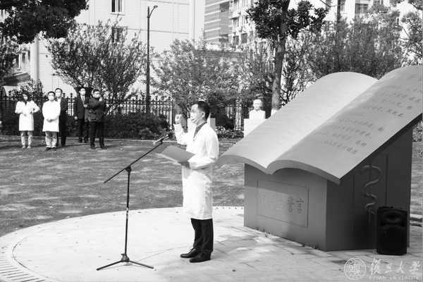 “健康所系,性命相托。当我步入神圣医学学府的时刻,谨庄严宣誓:我志愿献身医学……救死扶伤,不辞艰辛,执着追求,为祖国医药卫生事业的发展和人类身心健康奋斗终生。”在先贤的塑像前,华山医院第一批返沪医疗队队长、普外科主任医师陈进宏带领30名医学生重温医学生誓词。医学生们身着圣洁白衣,高举右手,庄严宣誓,重温踏入医学殿堂之初许下的庄严承诺。