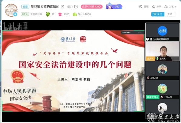 为深入学习贯彻习近平总书记围绕总体国家安全观发表的一系列重要论述精神,营造维护国家安全的浓厚法治氛围,提高学生的国家安全法治意识,增强学生防范和抵御安全的风险能力,4月14日,在第五个全民国家安全教育日到来前夕,复旦大学党委学生工作部组织开展了线上“光华论坛”专题形势政策报告会,邀请法学院教授刘志刚解读“国家安全法治建设中的几个问题”。作为创新形式的全民普法宣传教育活动,本次报告会通过哔哩哔哩“复旦卿云歌”直播间举办,共吸引近3万名直播间观众参与。