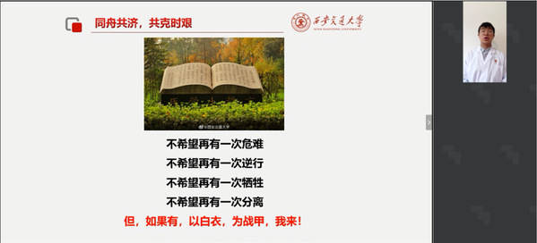 西安交通大学医学部徐显亮讲述了西安交通大学援鄂医疗队在此次战疫过程中的医者担当和强大力量。西安交大二附院援鄂医疗队队员罗花南医生才下高原又战武汉,哪里有需要,就到哪里去;西安交大援鄂医疗队主帅施秉银医生为了早一点加入一线战斗,坐绿皮火车前往武汉;巩守平医生提出“交二方案”,用首例新冠患者颅脑手术的成功交上了一份答卷;杨慧云护士精心护理患者,在患者心理干预、患者呼吸康复方面做了大量卓有成效的工作……徐显亮说,这些医务工作者们用实际行动诠释医者仁心,同时也用青春和汗水谱写了影响几辈西安交大人的“西迁精神”。