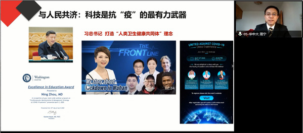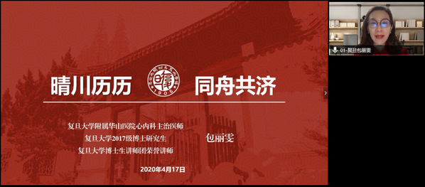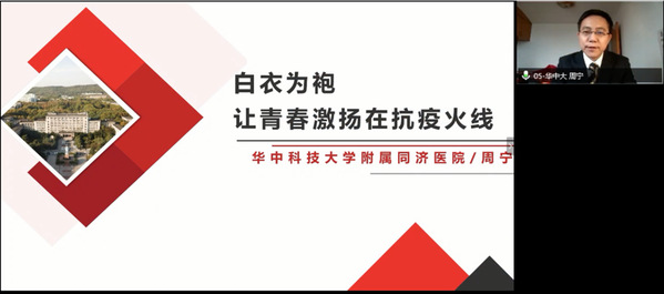 华中科技大学附属同济医院心血管内科副教授周宁分享了自己在同济医院作为“护心队”成员与新冠病毒斗争过程中的所见所闻。疫情来袭,作为武汉医务工作者,他们承担着极大的救治压力,却仍坚守岗位,履行着医者救死扶伤的的初心和共产党员冲锋在前的承诺,与国家同舟,与人民共济。作为武汉集中收治重症患者最多的定点医院,同济医院坚定信心,主动担当,大批党员放弃休假返岗,冲上了防疫一线,主动承担着最危险、最困难的工作。她所在的护心小分队里负责ECMO维护的是以“90后”护士为主体的护理专家团队。她们展示了90后医务工作者勇于担当、爱岗敬业的医者作风。此外,周宁还积极将科学、理性、权威的防疫信息传达给民众。在境外疫情日益加重的情况下,他们也在同国际同行连线分享防治经验。