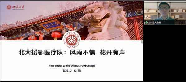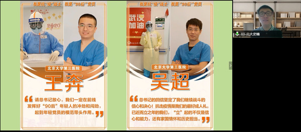 北京大学马克思主义学院史楠分享了北京大学附属医院援鄂医疗队中的逆行战士们背后的故事。付雪莹医生新婚不久便接到医院的通知决定立刻启程前往武汉,她的丈夫在同她告别时一边说着鼓励的话一边偷偷抹泪;暴婧医生在自己的防护服上写下“别怕,加油!”勉励自己,鼓励他人。还有许多援鄂医疗队员度过了自己不寻常的生日,更有一些人迎来了自己的政治生日——火线入党。在他们的队伍中,共有34名“90后”党员。习近平总书记在给他们的回信中指出,新时代的中国青年是好样的,是堪当大任的。抗疫一线比其他地方更能考验人这些青年人在抗疫一线英勇奋斗,锤炼自身能力,坚定初心使命,树立了深厚的家国情怀和历史担当。