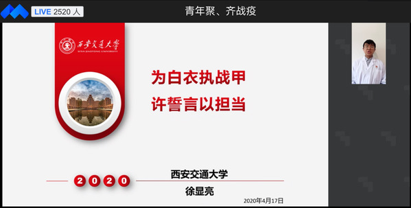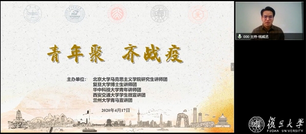 4月17日下午,由北京大学马克思主义学院研究生讲师团、复旦大学博士生讲师团、华中科技大学研究生红色理论宣讲团、西安交通大学学生微宣讲团、兰州大学青马宣讲团共同主办的“青年聚,齐战疫”五校联合宣讲在线举行。2500余名学生通过腾讯直播平台观看学习。