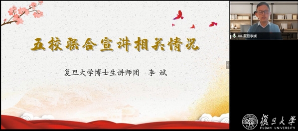 复旦大学博士生讲师团团长李斌介绍了五校战疫系列联合宣讲建设情况。本次联合宣讲共五门课程,以五所大学附属医院援鄂医疗队事迹为主要内容,展现高校援鄂医疗队坚定理想信念,继承医学前辈们的仁心仁术,不畏艰险,冲锋在前,用青春的蓬勃力量扛起新时代中国青年的责任担当。李斌表示,希望以此为契机,推动高校间开展常态化的优秀讲师跨校宣讲工作,他呼吁各校宣讲团精诚合作,共同策划更多高质量的宣讲,把制度讲明、把理论讲清、把成绩讲够。