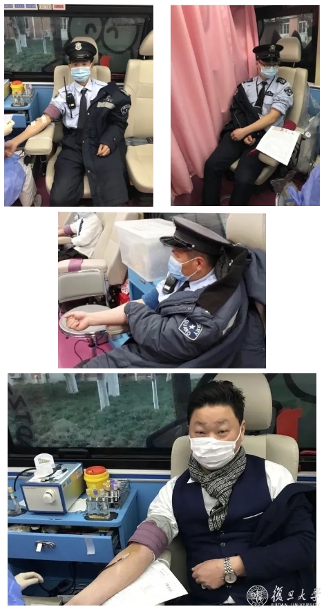 “作为复旦大学的一份子,我们也想贡献一份力量。”刚结束门岗执勤工作、匆匆赶到的枫林校区安保驻点队长张櫨日踏上了献血车,参与进疫情防控医学青年志愿者服务队组织的“热血战疫”活动。和他一样,枫林校区安保队员杜德仑、刘云灯和王聪,也带好口罩,做好防护,撸起袖子,加入献血队伍。