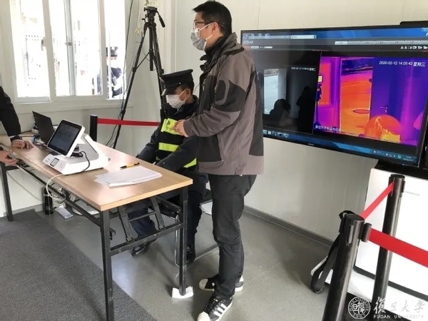 安保队员在邯郸校区正门测温箱前执勤