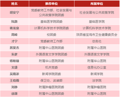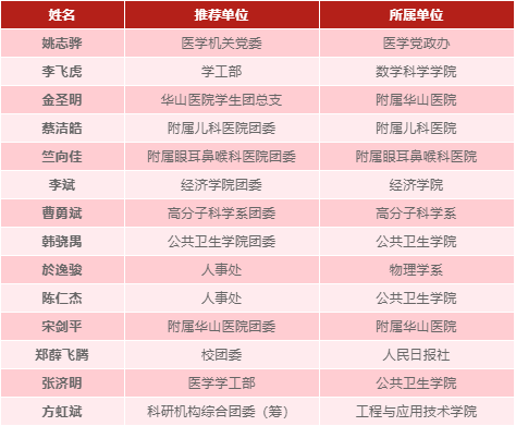 另14位入围终审答辩的获得第四届复旦大学青年五四奖章提名奖(排列依据答辩顺序):