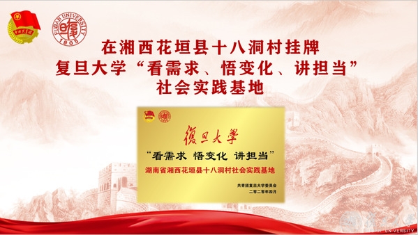 为进一步加强与地方的交流合作,形成育人合力,复旦大学团委与湘西自治州团委线上签署了社会实践框架协议,复旦大学“看需求,悟变化,讲担当”社会实践基地在十八洞村挂牌。据悉,未来双方将进一步在学生社会实践、调查研究、脱贫攻坚和乡村振兴等方面开展合作交流。