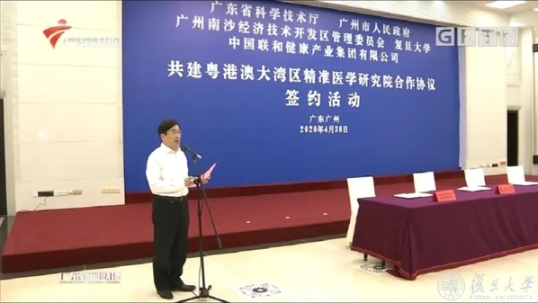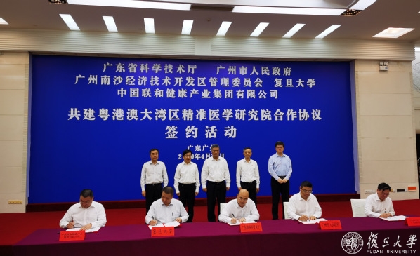 4月30日,复旦大学、广东省科学技术厅、广州市人民政府、广州南沙经济技术开发区管理委员会、中国联和健康产业集团有限公司五方齐聚羊城,共同签署《共建粤港澳大湾区精准医学研究院合作协议》。广东省省长马兴瑞、广州市委书记张硕辅、广东省副省长覃伟中、中国联和健康产业集团有限公司董事长陈国华,与复旦大学校长许宁生、常务副校长金力,以及相关领导、部门负责人出席了签约仪式。