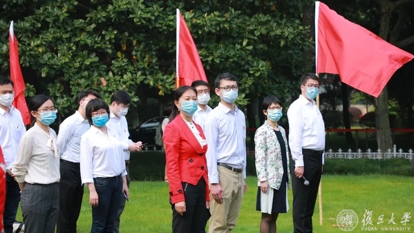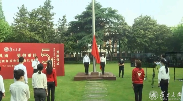本次升旗仪式通过哔哩哔哩、央视频、快手三个平台进行线上直播。复旦大学党委副书记尹冬梅、复旦大学援鄂医疗队队员代表、复旦大学青年五四奖章获得者代表、在校师生代表共同出席本次活动,校团委书记赵强主持活动。