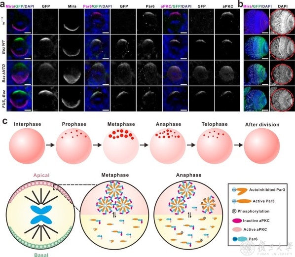 作为最早被报道的极性调控复合物,高度保守的Par复合物由Par3(果蝇中为Bazooka),Par6和aPKC组成,三者可以两两相互结合形成一个极性核心,并进一步招募其他蛋白发挥功能。以果蝇神经干细胞的不对称分裂过程为例,在细胞分裂开始时,均匀分布的Baz/Par6/aPKC逐渐聚集在细胞的顶端皮层,而细胞命运决定因子及其衔接蛋白(包括Numb/Pon复合物)在aPKC磷酸化的调控下,脱离顶端皮层,进而在细胞底端聚集,从而建立了顶-底端极性。极性分布于细胞两端的蛋白质及RNA随即被不均一地分离到两个子细胞中,从而使其具有不同的命运。细胞分裂完成后,细胞两端的蛋白聚集体去组装以进行下一轮的循环。在这项最新工作中,研究者发现Par复合物随着细胞周期,以液滴的形式凝聚于顶部皮层上。进一步体外及细胞内过表达实验表明,Par3由于其NTD结构域的寡聚可发生液液相分离现象,Par6通过其C末端氨基酸与Par3 PDZ3的特异结合而被富集到Par3凝聚体中,同时极大地促进了Par3的相分离能力。