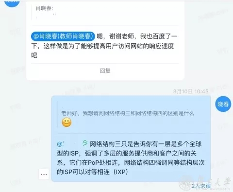钉群的答疑回帖直观地显示所针对的学生问题,便于有序地组织问题+答案,便于课上课后同学们及时了解问题与答案的来龙去脉;同时每条教师的发言后面,直观显示未读同学们的数目(也可查看具体哪些同学未读),可以及时关注学生的在线情况,不需要同学们主动回答“收到”而引起刷屏。