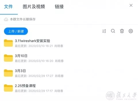 上课录播视频的顺利上传下载是线上教学的关键,钉群的群文件功能强大,可以永久存储文件。教师可以按目录组织上传课程资料,无需分享链接;学生在群中可以简单点击下载,也可以云端播放,方便学生随时学习观看。