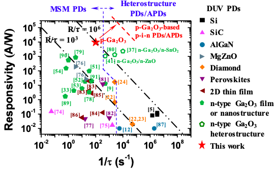 图2 不同薄膜材料制备的深紫外光电探测器的响应度、响应速度与增益带宽积