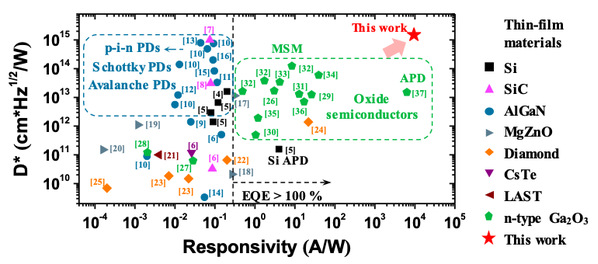 图1 不同薄膜材料制备的深紫外光电探测器的响应度和探测率