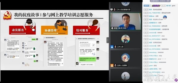 疫情期间,本科生新生骨干培训班2班的郑柯在社区防疫关卡担任志愿者,还加入了学校网上教学培训咨询志愿者团队,帮助解决网上教学过程中的各种“疑难杂症”。