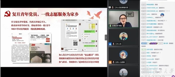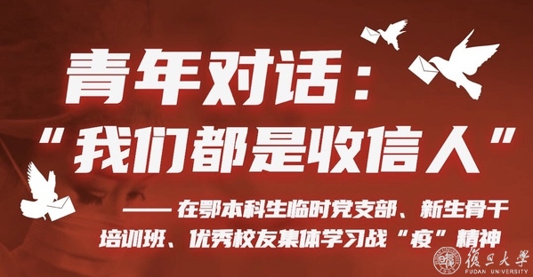 为深入学习习近平总书记给北京大学援鄂医疗队全体“90后”党员的重要回信精神,以实际行动回应校党委提出的“不惧风雨、勇担重任,做堪当民族复兴大任的复旦青年”号召,5月19日下午,复旦大学党委学生工作部举办“青年对话:我们都是收信人”活动,组织在鄂本科生临时党支部、本科生新生骨干培训班三期成员与青年校友代表集体学习战疫精神,激发青年学子勇担使命的信念,培养心系人民、爱国力行、坚韧不拔的奋斗精神。