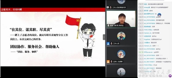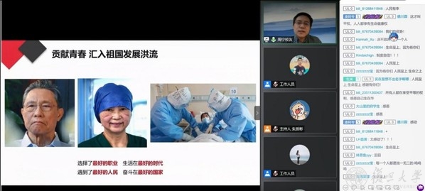 活动通过哔哩哔哩“复旦卿云歌”直播间举办,高峰时,超过1.8万人次在线收看。在复旦大学对外联络与发展处等部门的大力支持下,活动邀请华中科技大学同济医学院附属同济医院心内科副教授、副主任医师、第24届“中国青年五四奖章”获得者周宁,人民日报记者、人民日报赴武汉前方报道组成员郑薛飞腾,复旦大学附属中山医院外科护士长陈轶洪等三位优秀青年校友分享立足岗位抗击疫情的故事,交流学习总书记重要回信精神的心得。