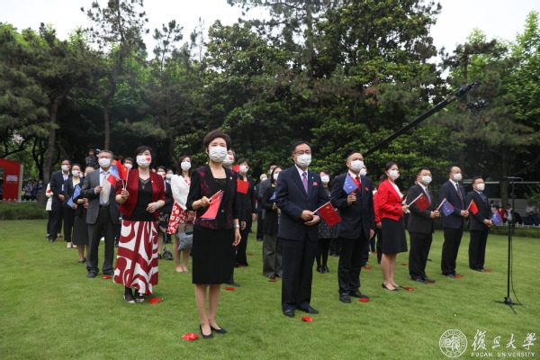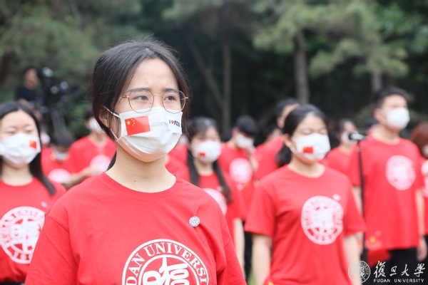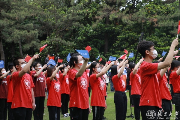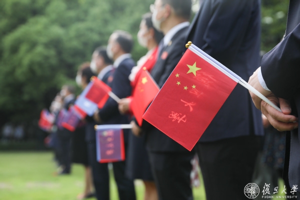 仪式最后,现场师生校友一同挥舞手中的国旗与校旗,与线上观礼者齐唱校歌。飘扬的国旗与校旗,传递着复旦人对祖国和母校的深情祝愿,凝聚着早日战胜疫情、重聚复旦校园的希冀,寄托着传承红色基因、担当时代重任的信念。“复旦复旦旦复旦,日月光华同灿烂!”