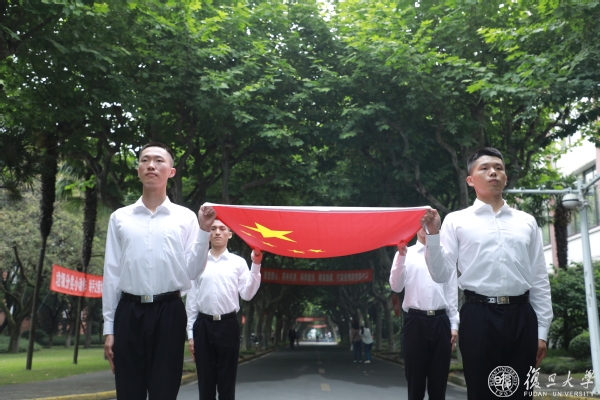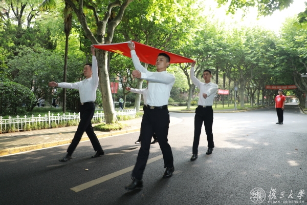 仪式现场,上海市青年五四奖章标兵胥博瑞护送国旗,交到国旗护卫队手中。国旗护卫队迈着整齐的步伐铿锵有力地护送五星红旗进场。在庄严的国歌声中,在线上、线下观礼复旦人的注目中,五星红旗冉冉升起。