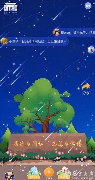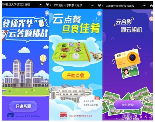 今年,受疫情影响,校友返校等校庆系列活动均搬到“云”上。世界各地的校友在“云聚复旦”中漫步岁月,在“共沐光华”间天涯一心,欢聚一堂的喜悦依然值得期待,对母校的祝福仍旧情意深长。小程序“相聚”母校。