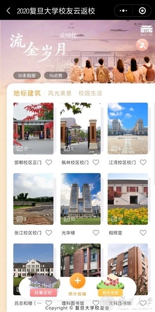 打开“云回忆”板块,复旦大学校友会精选的地标建筑、风光美景、校园生活等三类照片将校友们带回求学时光。通过“记忆分享”功能,校友们还可以生成一份基于本人在校年份的“记忆中的复旦园”电子相册。