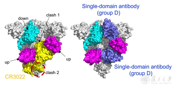 图2 全人源纳米抗体由于具有更小的体积,相比单抗CR3022能更好的结合三聚面隐藏表位,因此具有更强的病毒中和能力。