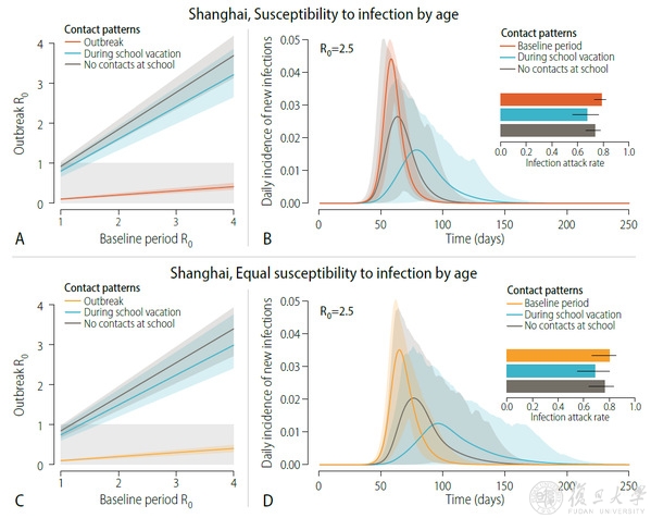 图2. 社会接触模式对疾病传播的影响,A:武汉增加社会距离期间的R0;B:上海增加社会距离期间的R0;C:无干预措施下武汉人群感染的罹患率;D:无干预措施下上海人群感染的罹患率