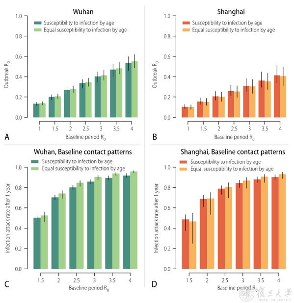 研究结果表明,增加社会距离期间,接触模式的改变引起了R0的大幅降低,武汉和上海均可下降至流行阈值1以下。若假设人群易感性在各年龄段没有差异,结论依然如此。假设无干预措施下,SARS-CoV-2经过一年的传播,人群感染的罹患率平均为53%-92%,武汉和上海的差异较小(图2)。
