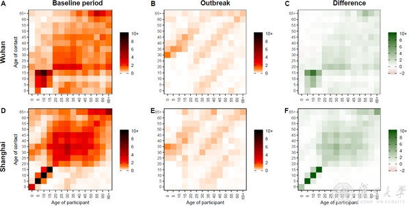图1. 基于年龄的接触矩阵,A:武汉新冠肺炎暴发前的接触矩阵;B:疫情暴发期间的接触矩阵;C:A与B的差值;D-F:上海的接触矩阵