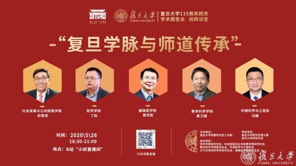 在复旦大学115周年校庆之际,为进一步加强师德师风建设,展现复旦师者风貌,传承复旦学人精神,校党委研究生工作部、研究生团工委、研究生会于5月26日举办复旦大学115周年校庆学术报告会“相辉讲堂”专场讲座,邀请社会发展与公共政策学院教授彭希哲、哲学学院教授丁耘、基础医学院教授姜世勃、数学科学学院教授高卫国、环境科学与工程系教授马臻等五位不同学科领域的第九届“研究生心目中好导师”候选人,以“复旦学脉与师道传承”为主题,分享学术科研历程和育人实践心得。
