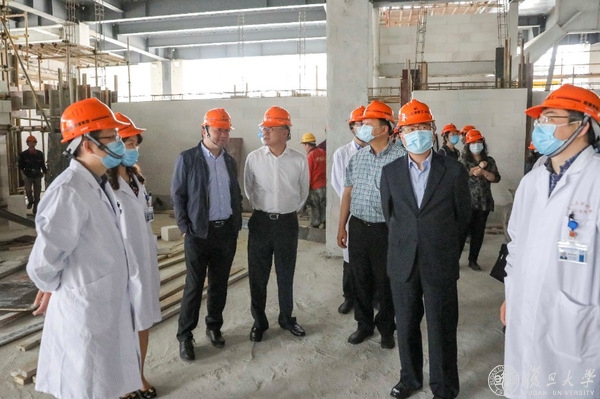 桂永浩和毛颖等一行实地察看复旦-闵行医教研协同发展研究院在建工地了解研究院目前的建设进度及各楼层规划布局,听取研究院建设推进情况汇报,并就相关问题进行了交流讨论。