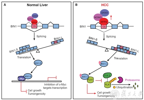 体内外实验发现NONO促进了肝癌细胞的增殖以及转移能力。研究人员进一步发现NONO可以结合下游靶基因前体RNA,其中敲低NONO可以引起MYC Box–Dependent Interacting Protein 1(BIN1)的剪接过程。在正常肝脏细胞中NONO低表达,下游靶基因BIN1产生更多的短转录本(BIN1-S),通过抑制cMYC对下游靶基因启动子结合抑制肝细胞的增殖和转移;而在肝癌中NONO异常高表达。NONO通过结合DExH-box helicase9(DHX9)以及splicing factor proline and glutamine–rich (SFPQ)对BIN1基因剪接,产生更多长转录本(BIN1-L),BIN1-L通过结合polo-like kinase 1(PLK1)并稳定其蛋白稳定性发挥促癌功能。在肝癌患者中,NONO常常和DHX9以及SFPQ共同高表达,同时高表达NONO以及SFPQ的肝癌患者显示更差的预后和更高的术后复发概率。新发现的RNA结合蛋白复合物DHX9/NONO/SFPQ对于肝癌患者的预后和精准治疗提供了潜在可能。