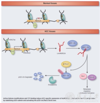 进一步研究lncMER52A发挥功能的机制,发现lncMER52A结合上皮-间质转化的关键调控蛋白p120-catenin,并增加p120-catenin稳定性,诱导其下游效应蛋白Rac1和Cdc42的活化,进而诱导肝癌细胞发生上皮-间质转化,促进肝癌的侵袭和转移。另外,初步探索lncMER52A在肝癌中异常表达的分子机制,发现lncMER52A的转录由MER52A LTR衍生的启动子区驱动。该启动子区的组蛋白活化修饰与lncMER52A的表达密切相关,且转录因子YY1介导了lncMER52A在肝癌中的转录。MER52A LTR可在不同的癌症中异常激活,但在不同的癌症中,其激活的位点并不一致,说明MER52A LTR的异常激活可能导致了不同的癌症特异转录本的产生。MER52A LTR在癌症中如何被激活,其组蛋白修饰的改变由何因素引起值得进一步研究。