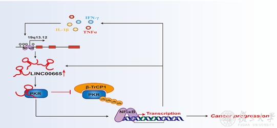 2月21日,《肝脏病学》(Hepatology)杂志在线发表了何祥火研究团队论文《炎症诱导的长非编码RNA LINC00665通过激活PKR/NF-κB信号通路增加肝癌的侵袭性》(“Inflammation-induced LINC00665 increases the malignancy through activating PKR/NF-κB pathway in hepatocellular carcinoma”)。该研究在肝癌中发现了一个受NF-κB信号通路调控新型信号分子长链非编码RNA LINC00665。研究发现,LINC00665在肝癌中的表达还受DNA甲基化的调控,LINC00665的高表达与TNM分期、BCLC分期呈正相关,且LINC00665高表达的肝癌患者预后较差。体内外的功能实验揭示LINC00665可以显著促进肝癌细胞的生长与成瘤。LINC00665通过与其相互作用蛋白双链RNA激活蛋白激酶PKR结合,抑制其泛素化降解,维持 PKR 的稳定性,增强 PKR 的激活,进而参与肝癌细胞NF-κB信号的激活。NF-κB信号通路是连接炎症和肿瘤发生的重要途径,此研究发现炎症LINC00665/PKR/NF-κB正反馈环在肝癌发生发展中起着重要的作用,其可能是肝癌治疗的一个重要的潜在靶点。