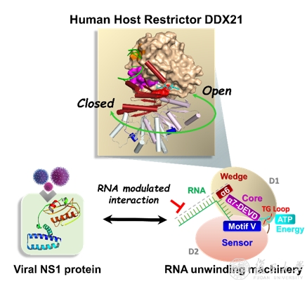 季节性流感病毒在全球范围内每年会导致29-65万例死亡和300-500万例严重感染。而同属于单链RNA病毒的新型冠状病毒在2020年更是肆虐蔓延迅速发展成为了全球性的疫情,造成灾难性的损失。研究RNA类病毒的致病机理,对相关新药研发包括疫苗的研制都具有重要意义。DDX21是一类重要的DEAD-box RNA解旋酶,兼具ATP依赖的RNA解旋酶活性和RNA折叠酶活性。DDX21在细胞生命周期中扮演多种重要角色,调控多种肿瘤组织的发生发展;还被报道与多种RNA病毒相互作用,通过形成DDX1-DDX21-DHX36-TRIF复合物来作为一类重要的病毒核酸传感器。作为宿主的限制性调节因子,DDX21与病毒PB1蛋白结合从而抑制病毒聚合酶的组装,抵抗流感病毒A的复制和合成。在病毒感染后期,病毒NS1蛋白可以与DDX21结合而释放PB1,从而逃避机体的天然防御机制。