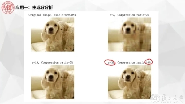 “奇异值分解的应用”教学视频中,四张内容相同的宠物狗图片排列在课件页面上,谢启鸿以图像压缩为例,讲解矩阵的奇异值分解在大数据科学中的应用。他以第一张图片为对比,分别更改后三张图片的正奇异值数据和压缩比,让学生直观感受到复原后图片清晰度的不同。