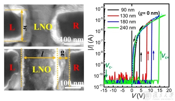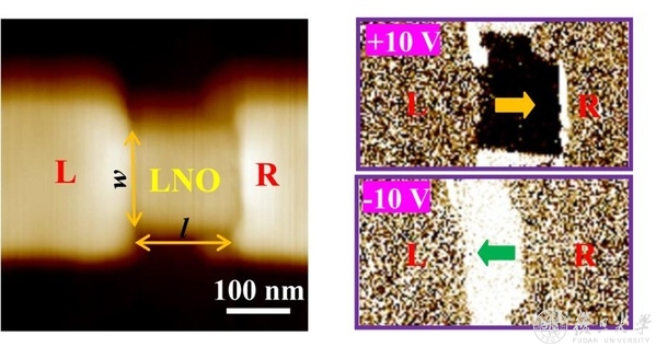 图2 铌酸锂(LNO)存储单元与左右电极(L&R)接触的扫描电镜成像(上左);不同尺寸存储单元的电流-电压曲线(上右);存储单元的原子力形貌像和面内电畴的压电成像(下)。