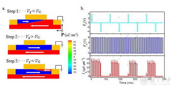 图3 铁电畴在源(D)、漏(S)和栅(G)电压控制下反转所形成畴壁的相场模拟结果(左);源电压(Vd)作用下栅脉冲电压(Vg)触发的非挥发开关电流(Ig)(右)。