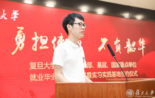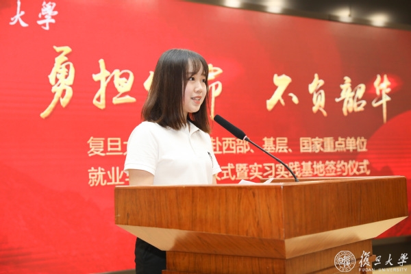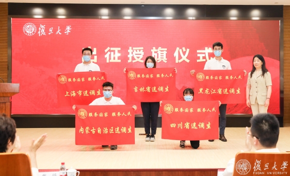 为响应习近平总书记“在为人民服务中茁壮成长、在艰苦奋斗中砥砺意志品质、在实践中增长工作本领”的号召,6月19日下午,“勇担使命 不负韶华”复旦大学2020届赴西部、基层、国家重点单位就业毕业生出征仪式暨实习实践基地签约仪式举行,激励引导毕业生正确认识自身担负的时代责任和历史使命,把个人理想抱负同国家前途、民族命运紧密相连,到基层去、到祖国最需要的地方去,贡献青年力量、书写青春华章。