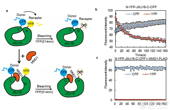 研究人员推测,MMD1可能影响了JMJ16的酶活。体内体外实验均证明MMD1确实调控了JMJ16的底物特异性, MMD1-JMJ16复合体可以去除肽段和核小体上的H3K9me3。那么MMD1又是如何调控了JMJ16的底物特异性呢?构建两个蛋白质的不同截短蛋白,鉴定出MMD1的MMD结构域(自定义,植物中保守)与JMJ16的C端FYR-C结构域互作(图 1),暗示着JMJ16的C端可能影响了其酶活结构域。为了验证这个假设,研究人员表达了只含有JMJ16-N端催化结构域的截短蛋白,发现JMJ16-N可以同时识别和去除H3K4me3和H3K9me3。进一步体外证明JMJ16-N和JMJ16 的C端FYR-C结构域相互作用,体内FRET实验也支持JMJ16的两端靠的很近或直接互作(图2)。