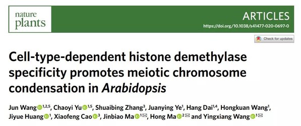 6月22日,复旦大学生命科学学院研究员王应祥和麻锦彪课题组联合美国宾州州立大学 (Pennsylvania State University) 教授马红在《自然-植物》(Nature Plants)发表了题为“Cell-type-dependent histone demethylase specificity promotes meiotic chromosome condensation in Arabidopsis”的研究论文,揭示了减数分裂细胞中组蛋白去甲基化酶底物特异性及调控染色质浓缩的分子机制。