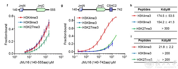 图3 荧光偏振鉴定 JMJ16酶活结构域及含锌指结构域对H3K4me3和H3K9me3的结合强度