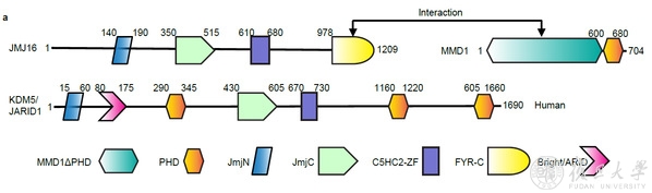 图1 MMD1和JMJ16蛋白的结构域及相互作用区域
