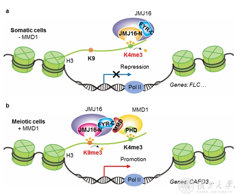 图4 JMJ16和MMD1在不同细胞微环境中调控基因表达的模型