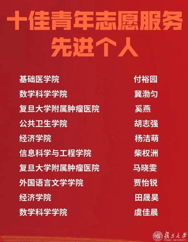 为弘扬志愿精神,表彰先进个人,共青团复旦大学委员会对2020年青年志愿者优秀个人展开评选。6月23日,“复旦大学十佳志愿者”评选活动落下帷幕,付裕园等10位候选人荣获“复旦大学十佳志愿者”称号。