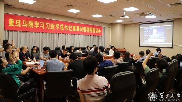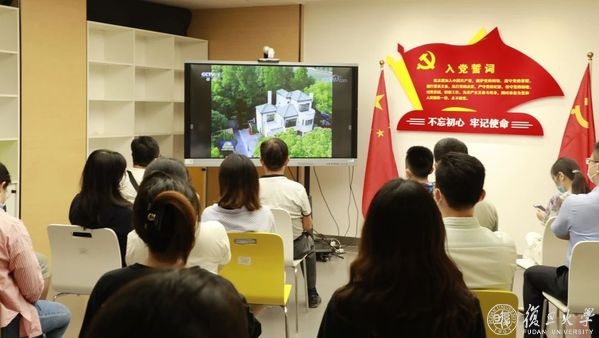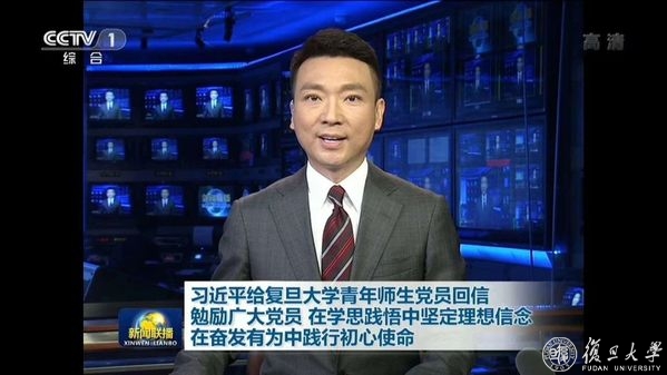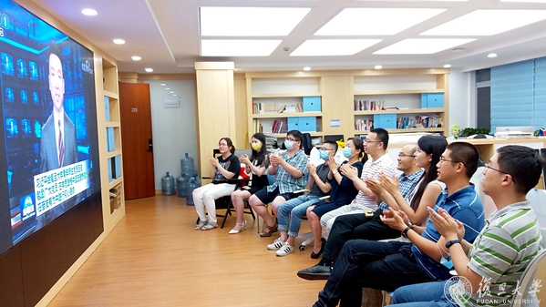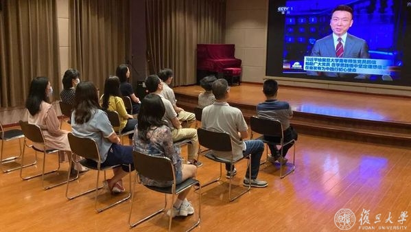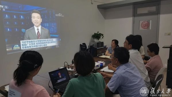 6月30日晚19:00,复旦大学逸夫科技楼二楼多功能厅早已座无虚席。校党委书记焦扬、校长许宁生等校党政领导和《共产党宣言》展示馆党员志愿服务队全体队员和指导老师早早守候在大屏幕前,大家难抑兴奋和激动之情,等待《新闻联播》节目的开播。当主持人播报完习近平总书记给复旦大学《共产党宣言》展示馆党员志愿服务队回信的新闻时,现场响起了热烈的掌声。