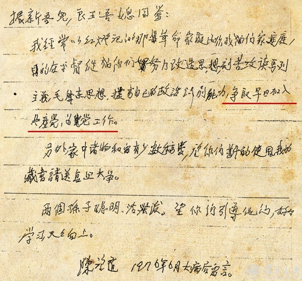 “振新吾儿,良玉吾媳同鉴:我经常以红灯记的那革命家庭来比作我们家庭,目的在乎督促你们努力改造思想,刻苦攻读马列主义毛泽东思想,提高自己的政治识别能力,争取早日加入共产党,为党工作。另外,家中诸物和留有少数稿费,望你们斟酌使用,我的藏书请送复旦大学。两个孙子聪明、活泼,望你们引导他们,好好学习、天天向上。陈望道 1976年6月大病后留言。”