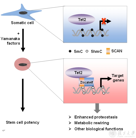SCAN结构域是一个高度保守的区域,主要发现在C2H2锌指结构域的N端,并特异地存在于脊椎动物中。但是,大部分ZSCAN家族成员的生物学功能尚不明了。在人的SCAN家族蛋白中一共包含有57个成员,而在小鼠的SCAN家族蛋白中包含有43个成员。以ZSCAN家族成员之一Zscan4f为例,复旦MCB团队研究发现Tet2蛋白能被Zscan4f招募到其靶基因的启动子区域,去除DNA甲基化并激活基因表达,刺激糖酵解途径和提高蛋白酶体活性,最终促进诱导性多能干细胞的重编程,丰富了人们对TET2调控靶基因转录和发挥生物学功能的科学认知。鉴于众多ZSCAN蛋白能够与TET2蛋白相结合,该工作也为ZSCAN蛋白功能研究提供了全新研究思路。