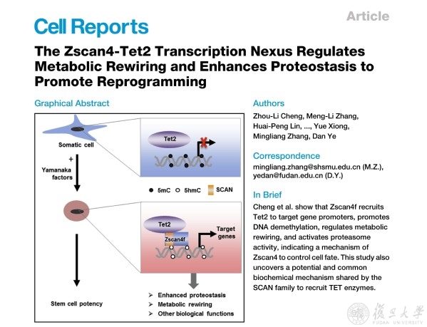 近日,MCB团队研究发现,ZSCAN蛋白能够通过其SCAN结构域与TET2蛋白相结合,为理解TET2是如何被招募道染色质上并发挥生物学功能提供了新的认识。7月14日,相关成果以《Zscan4-Tet2转录轴调控代谢及蛋白质稳态促进诱导性多能干细胞重编程》(“The Zscan4-Tet2 Transcription Nexus Regulates Metabolic Rewiring and Enhances Proteostasis to Promote Reprogramming”)为题在线发表于《细胞》(Cell)子刊《细胞报告》(Cell Reports)杂志。